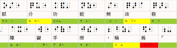 - 黃色:破音字。你可以在中文字或點字方格上點滑鼠右鍵以挑選別的注音符號(甚至修改明眼字和點字)。