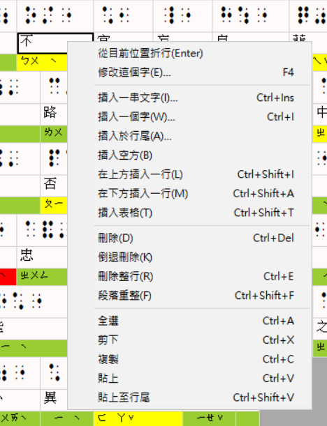 在雙視編輯視窗裡,將滑鼠移到中文字或點字的儲存格上點一下滑鼠右鍵,便會出現快顯功能表,其中有許多編輯和排版功能,參考下圖: