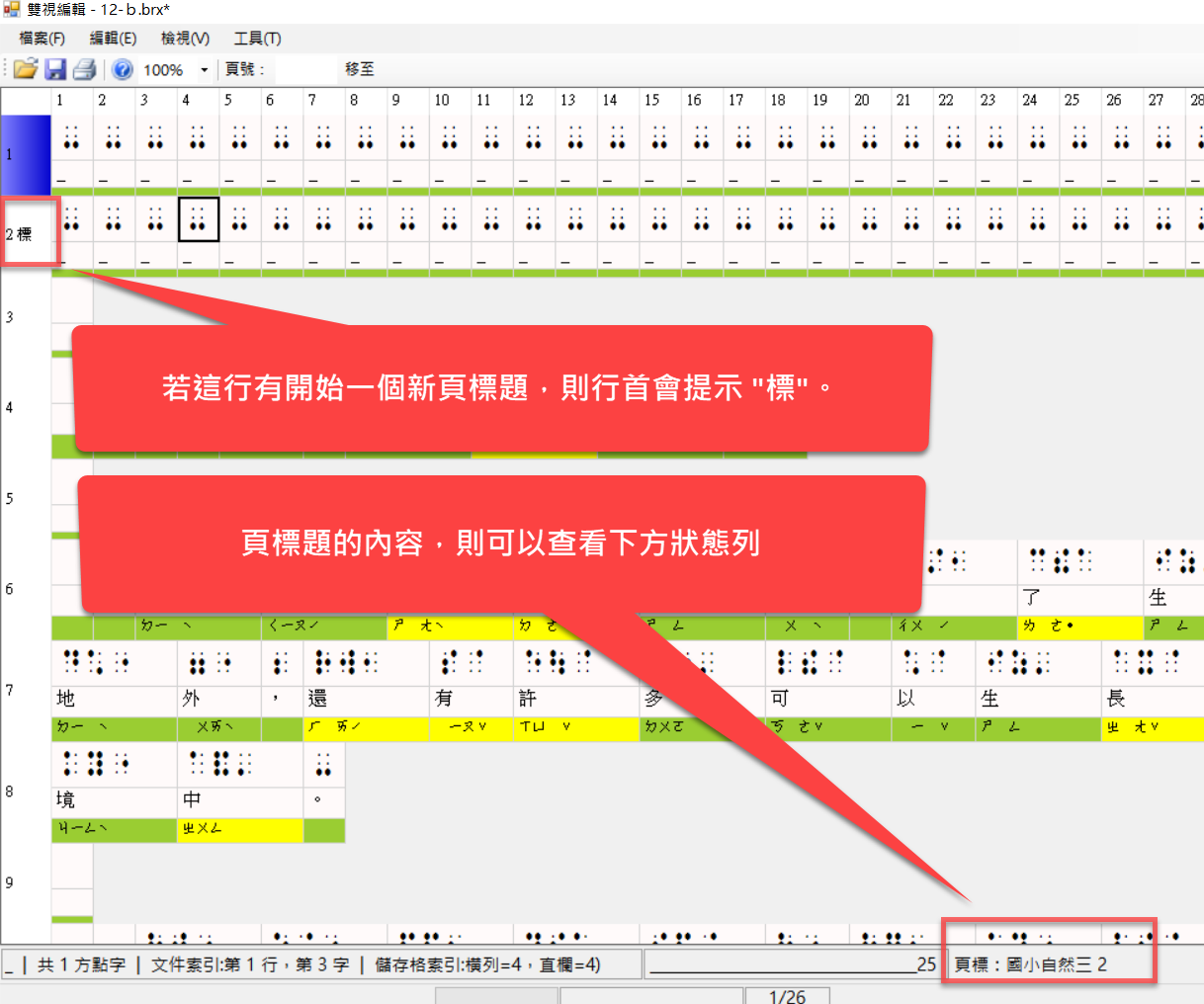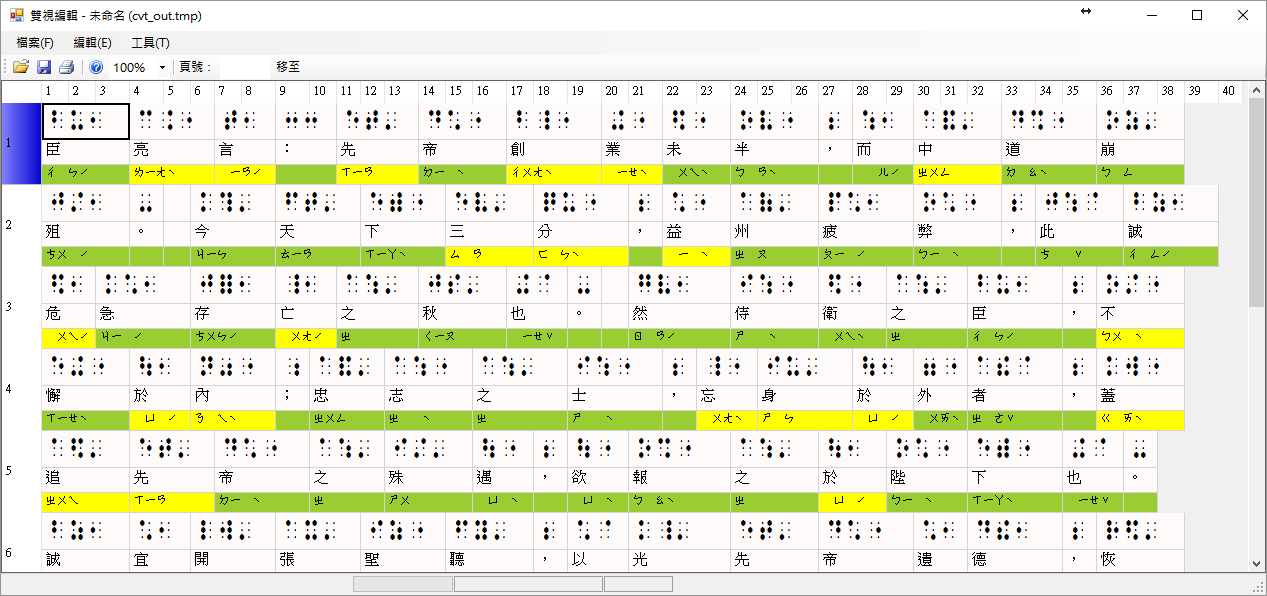 點字轉換工作完成後,會自動開啟雙視編輯器。在此視窗中,您可以再細部修訂明眼字、中文字的注音符號、以及點字,也可以插入新的點字、空方,以及排版,例如:折行、縮排等等。參考下圖: