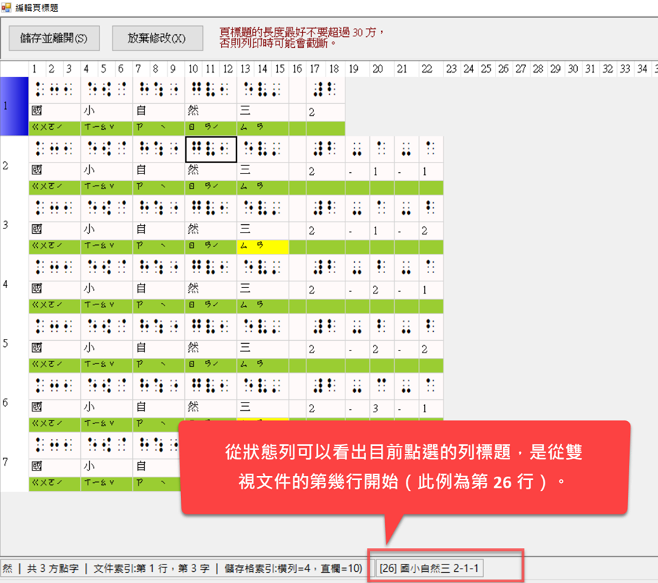 你還可以利用此技巧得知一列文字在轉成點字時,將會在哪一個地方斷字(折行),以便進行更細緻的前置作業。由於後續的點字校正編輯工作比較耗費資源,電腦處理的速度較慢,因此如果能在編輯明眼字的前置作業就盡量完成排版工作,自然能縮短點字書的製作時間。