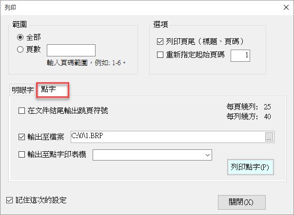 圖中的「輸出至點字印表機」和「輸出至檔案」選項,若二者皆勾選,則會將您資料分別列印至點字印表機和您指定的檔案。如果您的作業流程是先把所有點字文件都製作完畢再一次印出,可以只勾選「輸出至檔案」,等到所有檔案都輸出完畢,再將這些檔案利用「命令提示字元」視窗,透過 PRINT 或 TYPE 指令直接把整個檔案輸出至點字印表機。一般來說,您也可以利用 Windows 記事本來列印點字檔。