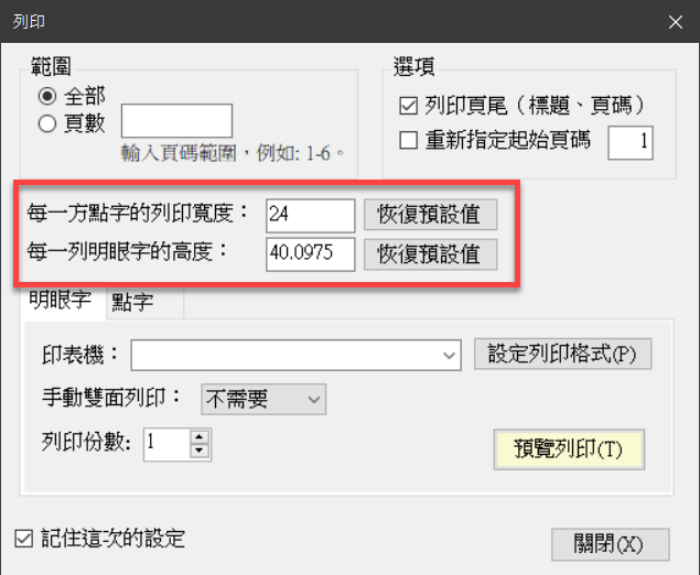 - 每一方點字的列印寬度:此參數其實是用來計算明眼字的字距,預設值為 24(點)。請根據您的點字印表機的輸出結果來調整這個參數:如果列印出來的內容太靠近紙張的右邊界,便可以先改為 22,並依照實際列印的結果來微調此參數。