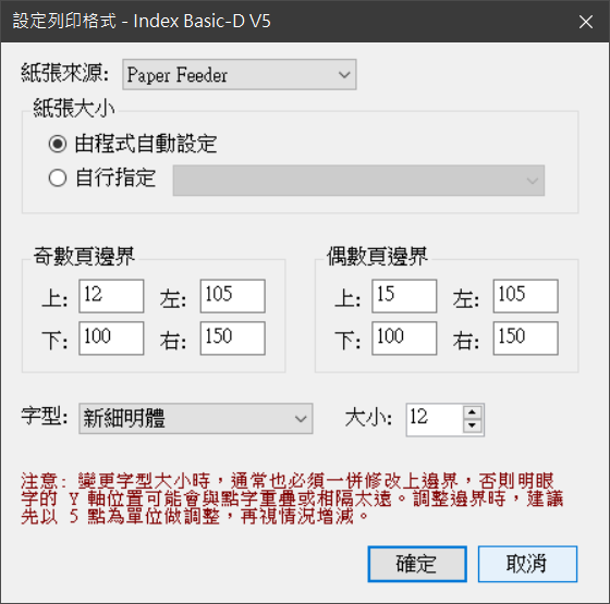 如果你修改了明眼字的字體大小,通常也必須一併調整列印的上邊界,否則列印出來的明眼字可能會與點字重疊或相隔太遠。你必須依你的環境實際測試之後,反覆調整頁邊界至最適當的範圍,這裡的圖例所顯示的,是測試時的設定 ,當時是將偶數頁的上邊界設定成比奇數頁少 2 點,左邊界則比奇數頁少 9 點。圖例中的設定可能不適用於你的環境。