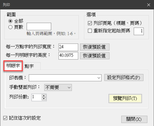 列印明眼字時,請先確定「列印」對話窗裡的頁籤是切到「明眼字」。如下圖所示: