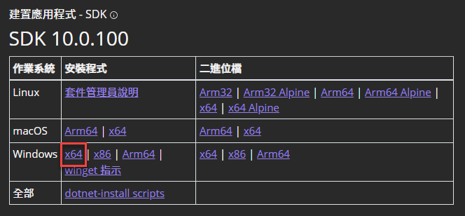 網頁開啟後,應該能看到多個不同作業平台的 .NET SDK 10.x 的下載連結。目前大多電腦都是 x64 架構,故選擇 Windows x64 的下載連結。如下圖:
