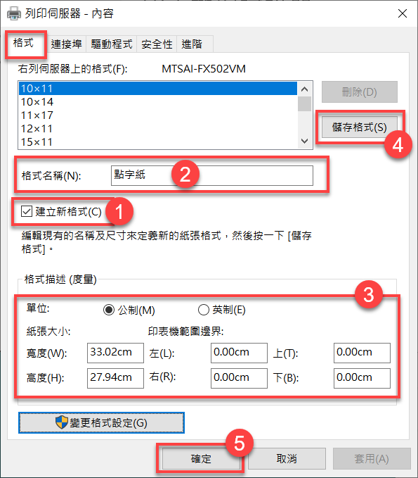 - 在「格式名稱」欄位中輸入「點字紙」(或者你喜歡的其他紙張名稱)。
