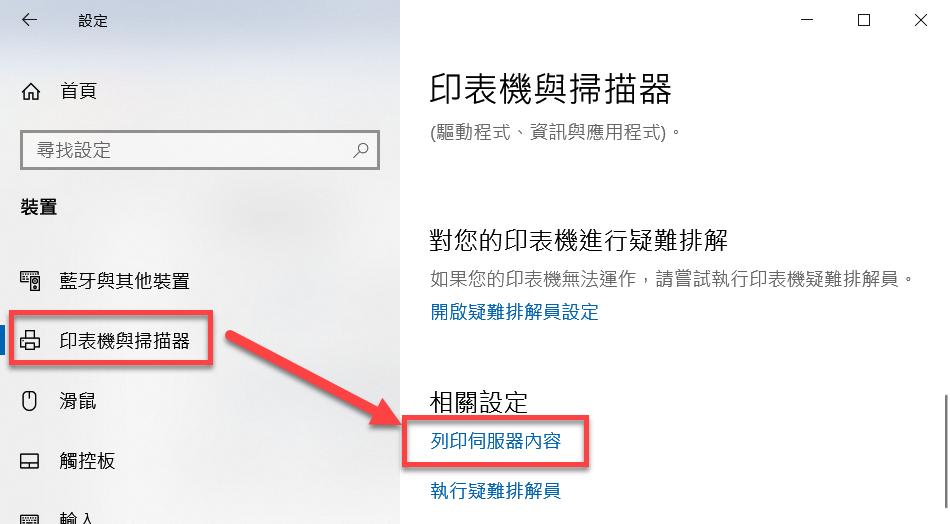 在 Windows 環境建立新尺寸的紙張,須透過「列印伺服器內容」來設定。如果是 Windows 10,你可以在控制台的「印表機與掃描器」視窗的下方找到「列印伺服器內容」,如下圖: